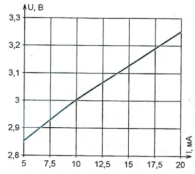 Вместо сгоревших установлены светодиоды HL-508H238WC диаметром 5 мм белого свечения номинальной яркостью 8 кд при токе 20 мА (максимальный ток - 100 мА) и угле излучения 15°. На рис. 3 показана экспериментальная зависимость падения напряжения на таком светодиоде от текущего через него тока. Его значение 5 мА соответствует практически полностью разряженной батарее GB1. Тем не менее яркость фонаря и в этом случае оставалась достаточной.