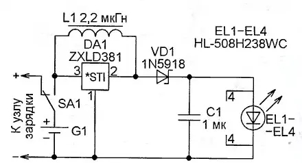Резистор R3 ограничивает ток разрядки батареи через соединённые параллельно светодиоды EL1-EL5, но его сопротивление слишком мало, и через светодиоды течёт ток, превышающий номинальный. Яркость от этого увеличивается незначительно, а скорость деградации кристаллов све-тодиодов заметно возрастает.