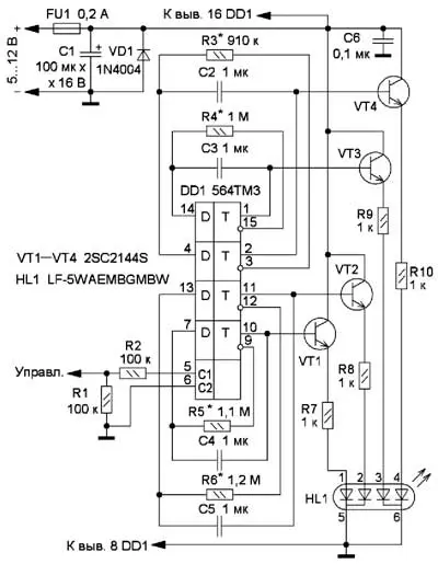 Светодиод подключён к выходам генераторов через эмиттерные повторители на транзисторах VT1-VT4, резисторы R7-R10 ограничивают ток через кристаллы светодиода. Микросхема 564TM3 содержит два управляющих входа C1 и C2, являющихся общими для всех входящих в неё D-триггеров. Один из них - С2 (вывод 6) соединён с общим проводом. При подаче на вход C1 высокого уровня работа генераторов затормаживается. Резистор R2 - защитный, резистор R1 обеспечивает работу генераторов при неподключённом управляющем входе устройства.