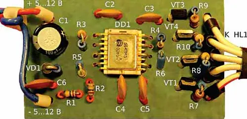 Кроме светодиода HL1 и плавкой вставки, все элементы установлены на плате размерами 31x50 мм из изоляционного материала (рис. 2). Выводы элементов вставлены в отверстия и с другой стороны соединены отрезками монтажного изолированного провода, например МГТФ-0,03. После проверки работоспособности и налаживания для предотвращения случайных замыканий и повышения механической прочности монтажную плату с обеих сторон покрывают лаком ХВ-784 или цапонлаком.