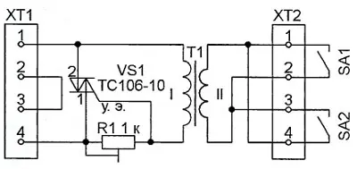 Одно из самых простых решений - применение маломощного изолирующего трансформатора, включённого в цепь управления коммутирующего сетевое напряжение симистора. Схема построенного по такому принципу выключателя показана на рис. 1. Сетевое напряжение 220 В подают на контакты 1 и 2 колодки ХТ1, а одну или несколько осветительных ламп накаливания подключают к её контактам 3 и 4 (или наоборот). Люминесцентные "энергосберегающие" лампы применять с таким выключателем не следует, поскольку потребляемый ими ток носит импульсный характер, и устройство будет работать неустойчиво. Последовательно в цепь питания ламп включён симис-тор VS1. Между его электродами 2 и управляющим включена первичная обмотка понижающего трансформатора Т1.