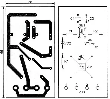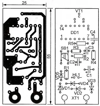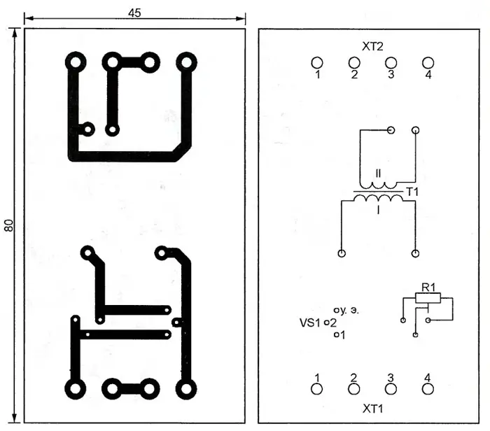 Элементы устройства размещены на печатной плате, изготовленной из односторонне фольгированного стеклотекстолита, чертёж которой показан на рис. 2. ХТ1 и ХТ2 - винтовые зажимные колодки серии Х9777В с шагом контактов 7,62 мм, но можно применить и другие или вовсе обойтись без них. Трансформатор Т1 - маломощный сетевой с напряжением вторичной обмотки 8...12 В и током первичной обмотки в режиме холостого хода не более 10 мА.