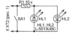 Возможная схема узла подсветки показана на рис. 4. Его элементы размещают в корпусе обычного выключателя, применив проводной монтаж и просверлив отверстия для светодио-дов. В каждом полупериоде светит лишь один из них, одновременно защищая другой от повышенного обратного напряжения. При желании один светодиод можно заменить обычным диодом любого типа, который будет выполнять лишь защитную функцию.