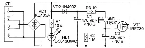 В исходном состоянии напряжение вторичной обмотки изолирующего трансформатора поступает на выпрямительный диодный мост VD1. Через диод VD2 выпрямленное напряжение заряжает конденсатор С1 до 12... 15 В. В этом состоянии светодиод HL1 подсвечивает кнопку пуска таймера SB1. Поскольку конденсатор С2 разряжен, полевой транзистор VT1 закрыт. Освещение остаётся выключенным.