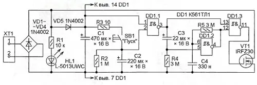 На рис. 8 показана схема ещё одного варианта таймера. В отличие от рассмотренного выше, здесь между цепью, определяющей продолжительность выдержки, и затвором полевого транзистора VT1 имеется узел на элементах-триггерах Шмитта микросхемы DD1. Напряжение питания этой микросхемы поступает с конденсатора С1.