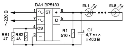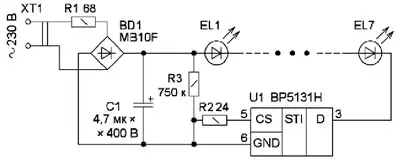 Сейчас в быту сетевые светодиодные вытесняют другие виды осветительных ламп. Сначала в светодиодных лампах применяли выводные светодиоды, потом стали применяться светодиоды для поверхностного монтажа (SMD-светодиоды), которые смонтированы на плате с алюминиевым основанием, что обеспечивает более эффективное отведение тепла. Сейчас трендом является применение линейных стабилизаторов тока на микросхемах и светодиодов с номинальным напряжением около 36 В, за счёт чего сокращается их общее число в лампе. Примером могут быть лампы торговой марки "Онлайт", схема одной из них показана на рис. 1. Другие элементы такой лампы - выпрямительный мост, сглаживающий конденсатор, микросхема стабилизатора тока и защитный резистор, играющий роль предохранителя. Иногда мост и стабилизатор объединены в одном корпусе - это ещё один тренд. Схема такого варианта лампы показана на рис. 2.