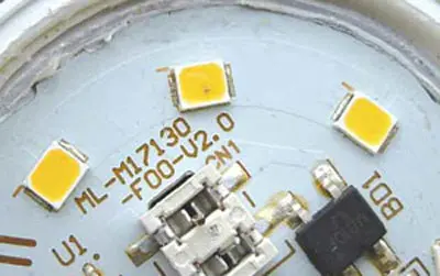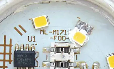 После этого сразу возникает вопрос: где взять исправный светодиод? Поскольку в быту, как правило, используется несколько однотипных ламп, в качестве донора светодиодов может служить аналогичная лампа, которая раньше уже вышла из строя. С её платы можно снять исправные светодиоды. Эту плату надо вынуть из лампы и, используя специальный нагреватель для плат или утюг, аккуратно с помощью пинцета снять с неё светодиоды.