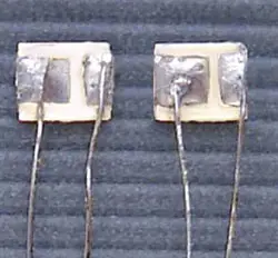 Но установить исправный светодиод непосредственно на место неисправного непросто, о чём сказано выше. Выходом из этой ситуации может быть установка исправного светодиода не на посадочное место удалённого, а рядом с ним, используя для этого короткие отрезки лужёного медного провода. Для этого сначала к контактным площадкам светодиода припаивают такой провод диаметром около 0,2 мм (рис. 5). Затем провода припаивают к контактным площадкам на плате лампы.