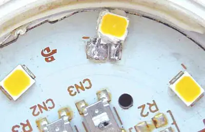 Но в связи с этим у радиолюбителей часто возникает вопрос: ремонтировать светодиодные лампы или нет? Это, конечно, решает каждый радиолюбитель. Один из аргументов "за" - экологический фактор, ведь чем дольше проработает лампа, тем меньше мусора будет на нашей планете. Поэтому если есть время и возможности, почему бы этого не сделать? Однако при этом возникают определённые, зачастую непреодолимые трудности. Одна из основных - демонтаж неисправного и монтаж исправного SMD-светодиода.