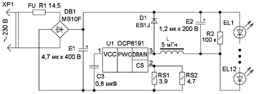 На алюминиевой печатной плате, служащей ещё и теплоотводом, припаяны 12 светодиодов поверхностного монтажа белого свечения типоразмера 3528. Один из светодиодов был с чёрной точкой, как оказалось - сгоревший. Алюминиевая подложка плотно вставлена в корпус, оказавшийся внутри также алюминиевым, поверх покрытым пластиком. Корпус тоже должен выполнять функцию теплоотвода, но площадь соприкосновения тонкой алюминиевой платы корпусом невелика, атеп-лопроводящая паста отсутствует. Плата со светодиодами подпаяна к драйверу двумя проводами. Внешний вид разобранной лампы изображён на рис. 1. Удалив герметик, поддевают ножом и извлекают плату со светодиодами, но вынуть её из корпуса не дают провода, соединяющие драйвер с цоколем лампы. Поддев ножом, извлекают центральный контакт цоколя и разгибают идущий к нему провод. Места кернения резьбовой части цоколя к корпусу высверливаем сверлом диаметром 1,5 мм. Сняв цоколь, можно достать плату драйвера. На ней оказался разрушен оксидный конденсатор с обозначением на плате Е2. Часть элементов на плате для поверхностного монтажа установлена со стороны печатных проводников, а на противоположной стороне установлены дроссель, два оксидных конденсатора и микросхема. Схема драйвера с обозначениями элементов, как на плате, показана на рис. 2. Резистор, условно обозначенный как R1, находится не на плате, а соединяет центральный контакт цоколя лампы с ней. Схема драйвера построена на микросхеме OCP8191 в корпусе ТО-92. Микросхема представляет собой неизолированный квазирезонансный понижающий преобразователь для питания светодиодов со стабилизацией тока. В её состав входят MOSFET транзистор с максимальным напряжением сток-исток 550 В и узел управления. В микросхеме есть различные виды защиты: от перегрева, от короткого замыкания в нагрузке, от превышения максимального тока. Ток через светодиоды задают резисторами RS1 и RS2.