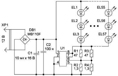 Схема драйвера этой лампы представлена на рис. 7. Он собран на микросхеме U1 в корпусе SOP 8. К сожалению, однозначно идентифицировать микросхему не удалось. На разных лампах неизменной была надпись на корпусе 1086. Светодиоды в лампе типоразмера 3528, с номинальным напряжением 3,4 В. Все остальные элементы - для поверхностного монтажа. При подключении к источнику напряжением 12 В выяснилось, что лампа потребляет ток 280 мА. При увеличении напряжения до 14 В ток через лампу возрос до 290 мА, а при снижении напряжения питания до 10,2 В он уменьшился до 270 мА.