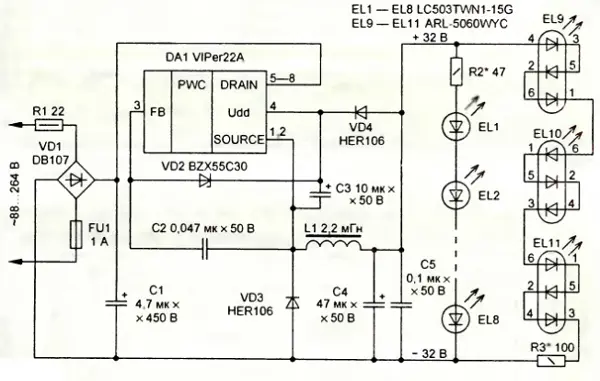 Работа подобного импульсного понижающего стабилизатора напряжения и физические принципы его функционирования описаны в [1] (рис.1,в и рис. 2,6). Поэтому более подробно рассмотрим последовательность проектирования сетевого преобразователя для питания 17 ультраярких светодиодов, используемых в описываемом устройстве (рис. 1). Среди них EL1- EL8 - стандартные 5-миллиметровые светодиоды LC503TWN1-15G и EL9-EL11 - чип-све-тодиоды ARL-5060WYC по 3 шт. в прямоугольном корпусе PLCC6 размерами 5x5 мм с допустимым прямым током до 40 мА и прямым падением напряжения примерно 3,2 В на каждом диоде. Такой выбор светодиодов в экземпляре автора обусловлен необходимостью освещения компьютерной клавиатуры. Первые светодиоды обладают малым углом излучения - 15° по уровню половинной мощности, вторые - большим - 120°. В результате в суммарном световом пятне будут отсутствовать резкие границы, причем освещенность в центре больше, чем на периферии. Цветовой оттенок такого источника света - средний между холодным и теплым белым, что обусловлено параметрами использованных светодиодов.