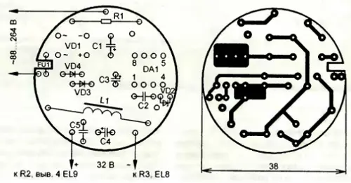 Светодиодная нагрузка R2R3EL1 - EL11 смонтирована на другой печатной плате из двусторонне фольгированного стеклотекстолита толщиной 0,5... 1 мм (рис. 4). Участок фольги многоугольной формы в центре платы предназначен для отвода тепла от светодиодов поверхностного монтажа EL9-EL11. Токоограничивающие резисторы R2 и R3 - РН1-12 типоразмера 1206. Две платы соединяют между собой пайкой в соответствующих контактных площадках трех отрезков медного провода диаметром 0,7 мм и длиной примерно 7 мм, на которые в качестве ограничительных букс надеты отрезки пустотелых пластиковых стержней от шариковых ручек. Два провода подают питание на плату со свето-диодами, а третий обеспечивает необходимую жесткость конструкции. При соединении смежными являются стороны, свободные от элементов на обеих платах. В отверстия контактных площадок, отмеченных звездочками, вставляют и с двух сторон пропаивают короткие отрезки провода. Вначале с помощью ЛАТР желательно убедиться в стабильности выходного напряжения 32 В во всем интервале изменения сетевого напряжения (88...264 В), при этом вместо светодиодов подключают резисторы общим сопротивлением 800 Ом Затем свето-диоды устанавливают на место, а вместо постоянных токоограничивающих резисторов R2 и R3 временно спаивают подстроечные сопротивлением 150 Ом При измерениях следует остерегаться электрического удара током, поскольку все элементы устройства гальванически связаны с питающей электросетью. Все изменения выполняют только в отключенном состоянии. Подстроечные резисторы регулируют диэлектрической отверткой. Ток через каждую цепь светодиодов контролируют миллиамперметром Хотя использованные светодиоды допускают прямой ток до 40 мА с соответствующим увеличением яркости свечения, в целях достижения заявленной долговечности светодиодов подстройкой резисторов ток устанавливают равным 20 мА. Примерно через 5 мин после включения стабилизируется тепловой режим светодиодов, поэтому необходима дополнительная подстройка тока. При наличии одного миллиамперметра ток в каждой светодиодной цепи регулируют по очереди. В завершение подстроечные резисторы заменяют постоянными найденного сопротивления.