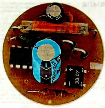 Чертеж печатной платы преобразователя, выполненной из односторонне фольгированного стеклотекстолита толщиной 1...1,2 мм, показан на рис. 2, а ее внешний вид - на рис. 3. Конденсатор С1 впаивают с зазором 7...8 мм до платы, так как его надо наклонить к центру платы, чтобы он разместился в примененном цоколе от сгоревшей энергосберегающей лампы.