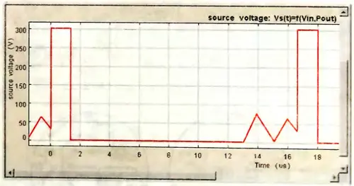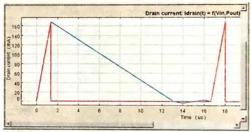 С помощью инструмента Waveforms программа NIVDS позволяет смоделировать режимы ШИ контроллера. На рис. 5 показана диаграмма импульсного тока в контроллере при сетевом напряжении 220 В, практически совпавшая с результатами контрольных измерений. Интервал О...1,5мкс соответствует открытому состоянию коммутирующего транзистора микросхемы DA1 (прямой ход преобразователя). Синим цветом показан график тока в накопительном дросселе во время обратного хода преобразователя. Интервал 1,5... 13 мкс соответствует этапу передачи в нагрузку энергии, накопленной дросселем во время прямого хода. Интервал 13...16,6 мкс - так называемая бестоковая пауза б работе преобразователя, когда возникают свободные затухающие колебания напряжения и тока в выходной цепи. Более наглядно эти колебания иллюстрирует снятая диаграмма напряжения на истоке транзистора относительно общего провода питания (рис. 6), где хорошо заметно, что затухающие колебания напряжения происходят относительно уровня 32 В, соответствующего выходному напряжению преобразователя. Выходной фильтр С4С5 снижает пульсации выходного напряжения до 300 мВ.
