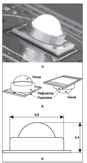 На рис. 1 показан внешний вид светодиодов данной серии, а также устройство и конструктивные размеры. Подложка светодиода выполняет две функции: она имеет контакты для подключения светодиода к источнику питания и является теплоотводом.