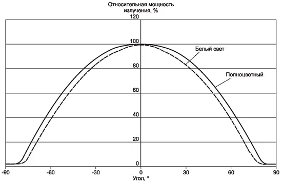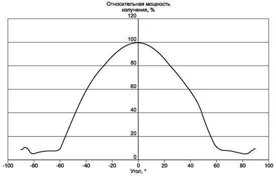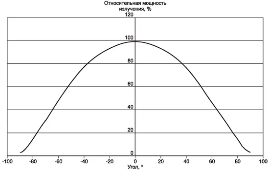 На рис. 2 приведены графики спектрального излучения светодиодов, а на рис. 3 - угловая диаграмма интенсивности излучения. Из рис. 3 хорошо видно, что основной поток излучения приходится на угол ±30°.