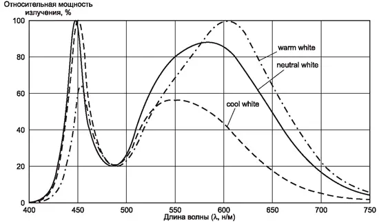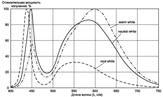- neutral white ("нейтральный" белый) - цветовая температура в диапазоне 3700...5000 °К;