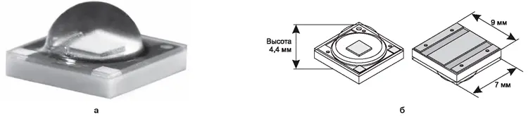 Рис. 5. Внешний вид (а), конструкция и конструктивные размеры (б) светодиодов серии Cree XLAMP XP-E