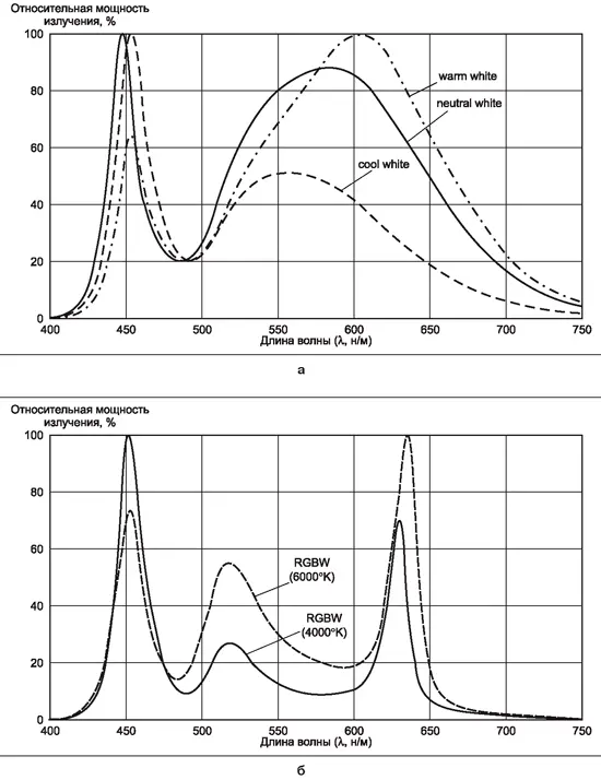 Рис. 9. Спектральные характеристики излучения светодиодов Cree XLAMP МС-E белого света (а) и полноцветных светодиодов (б)