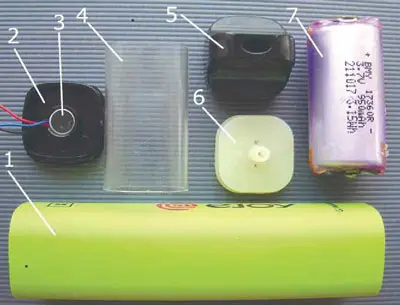 О конструкции одноразовых электронных сигарет (ОЭС) и возможности использования входящих в них радиоэлементов было рассказано в [1]. Эта статья продолжает тему, и в ней будет приведено описание конструкции карманного фонаря. Донором для этой конструкции стала ОЭС, показанная на рис. 1. Входящие в её состав элементы, которые пригодятся для изготовления фонаря, показаны на рис. 2. В первую очередь, это, конечно, Li-Ion аккумулятор 7, который, судя по маркировке, имеет ёмкость 950 мА·ч. Во-вторых, датчик давления (затяжки) 3, который установлен в пластмассовой заглушке 2. У этого датчика светодиод синего свечения. Третий элемент - корпус 1, который у этой ОЭС оказался металлическим (скруглённый квадрат размерами в сечении 20x20 мм). И это неплохо, поскольку повышается прочность всей конструкции. Важным элементом также является пластмассовый мундштук 5, полезными будут также пластмассовая кассета 4 и амортизирующая прокладка 6. Кроме того, есть ещё и фильтр-прокладка, по структуре похожая на войлок. Разобрать эту ОЭС не составит труда, поскольку заглушка 2 и мундштук 5 закреплены в корпусе 1 с помощью трения и вставляются и вынимаются с небольшим усилием. Для вынимания можно использовать не слишком острый предмет.