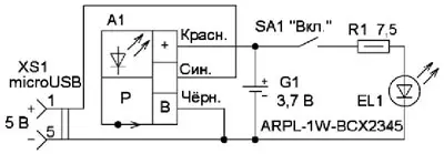 Дополнительными элементами в самом простом варианте будут светодиод и выключатель. Схема этого варианта показана на рис. 3. Здесь датчик давления А1 выполняет функции драйвера и индикатора зарядки Li-Ion аккумулятора [1], резистор R1 необходим для ограничения тока через светодиод на безопасном уровне. В этом варианте применён светодиод ARPL-1W-BCX2345 [2] с мощностью рассеивания 1 Вт, поскольку ёмкость аккумулятора достаточна для получения повышенной яркости фонаря.