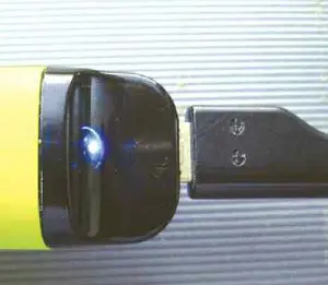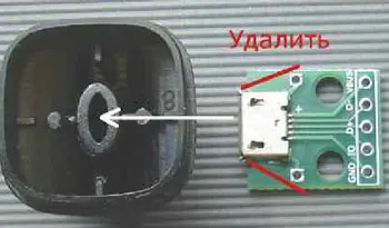 Но сначала рассмотрим конструкцию фонаря. В мундштуке был установлен разъём microUSB, к которому подключают зарядное устройство сотового телефона. Можно применить плату с ус-тановленным на ней разъёмом (рис. 4). Для этого внутренние перегородки мундштука надо удалить, а овальное отверстие расточить так, чтобы в него смог войти разъём microUSB (рис. 5). При этом потребовалось удалить участки платы рядом с разъёмом. После этого плату следует закрепить в мундштуке с помощью клея. Хорошие результаты даёт применение молекулярного моментальногоклея c так называемым сварочным гранулятом. Поскольку мундштук тёмный, но прозрачный, на плате был установлен датчик давления (светодиодом наружу), его можно закрепить с помощью термоклея. При зарядке аккумулятора светодиод включается и светит постоянно (рис. 6). По окончании зарядки он выключается. При отключении зарядного устройства он кратковременно вспыхивает.