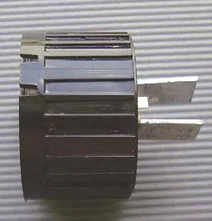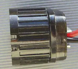 Применённый светодиод EL1 имеет широкую диаграмму излучения, и если необходимо получить узкий луч, следует применить специальную оптическую систему коллиматор-держатель (линзу) [3], с помощью которой угол излучения не превысит 10 градусов. Такие светодиоды иногда продаются вместе с линзой. Чтобы облегчить тепловой режим светодиода, к нему желательно припаять небольшой медный U-образный теплоотвод. Как это сделать, подробно рассказано в [4]. Результат показан на рис. 7. К выводам светодиода припаивают провода, которые желательно промаркировать с помощью цветной ПВХ-трубки. Светодиод в сборе приклеивают с помощью клея к заглушке, в которой предварительно делают соответствующее отверстие (рис. 8). Здесь также применён моментальный клей.
