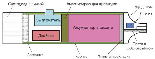 В результате конструкция фонаря выглядит, как показано на рис. 9. Здесь использовано максимум элементов от ОЭС. Фонарь собирают в следующей последовательности. Сначала с правой стороны устанавливают амортизирующую прокладку, она должна упираться в корпус выключателя, затем вставляют аккумулятор, размещённый в кассете, и потом мундштук, в котором установленфильтр-прокладка. С левой стороны устанавливают так называемый драйвер, о котором речь пойдёт далее, затем светодиод с линзой и заглушкой. Предварительно, конечно, надо сделать отверстие для выключателя, и затем - все соединения с помощью провода в надёжной изоляции, например МГТФ-0,12. Переключатель лучше применить движковый и достаточно "тугой", чтобы фонарь не включился при транспортировке. Размеры выключателя должны быть достаточными для того, чтобы его корпус удерживал амортизирующую прокладку, но было бы достаточно места для драйвера. Впрочем, конструкция может быть и другой. Можно применить другой разъём и другие элементы, главное, чтобы внутри не было КЗ и ничего не болталось.
