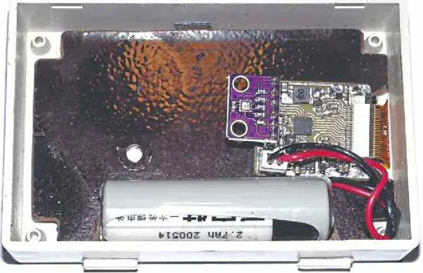 Модуль BME280 (он сиреневого цвета на рис. 11) своим ответным гнездовым разъёмом надет на штыревой разъём платы прибора. Гальванический элемент приклеен тонким скотчем с двусторонним липким слоем к пластине и боковой стенке корпуса. Как только разъём кабеля от элемента вставлен в соответствующую ответную часть на плате, прибор сразу начинает работать, и остаётся только защёлкнуть крышку. Это необходимо сделать ровно в полночь. Перезапустить программу ("Reset") можно, если замкнуть на пару секунд между собой два крайних контакта (1 и 3) разъёма, предназначенного для программирования МК (XR1 на рис. 1), а затем разомкнуть их. Это также следует сделать ровно в полночь.