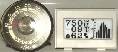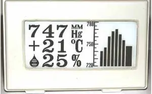 Показания прибора (рис. 12) сняты после того, как он проработал восемь дней. В середине этого периода в Москве наблюдалось аномально высокое давление, доходящее до 770 мм рт. ст., которое постепенно снижалось, что можно определить по гистограмме. Как можно убедиться из рис. 13, контрастность изображения DES E-ink-дисплея ничуть не снижается при отрицательных температурах, что является большим преимуществом перед обычным E-ink-дисплеем, у которого изображение в этих условиях существенно тускнеет. Применение DES E-ink-дисплея GDEW029M06 совместно с МЭМС-датчиком BME280, МК EFM8SB20F16, литиевым элементом ER14505 и микропотребляющимстабилизатором STLQ015M30R позволили сконструировать прибор, который, помимо цифровых значений атмосферного давления, температуры и влажности, выводит на дисплей гистограмму давления за последние восемь дней. Это позволяет в некоторой степени осуществлять прогноз давления на следующий день, что часто бывает жизненно необходимо для метеозависимых людей. Прибор работает в течение 10 лет без замены элемента питания и, как следствие, не требует никакого обслуживания. Это является большим преимуществом по сравнению с похожими приборами (с OLED-дисплеями или дисплеями с ЖКИ), в которых приходится часто менять элементы, т. е. постоянно нуждающимися в обслуживании.