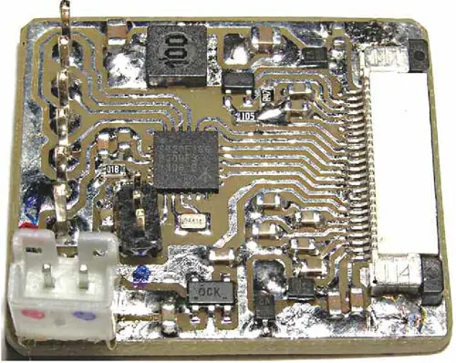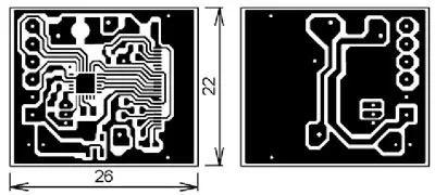 Как видно из рис. 1, схема не отличается особой сложностью, поэтому платалегко разводится и имеет размеры всего 22x26 мм. Плата разведена с помощью программы SprintLayOut v.6. Файл разводки в формате *.lay6 приведён в дополнительных материалах к статье на сайте журнала. Чертёж платы, изготовленной из фольгированного с двух сторон стеклотекстолита толщиной 1,5 мм, показан на рис. 7, а расположение элементов в масштабе 2:1 - на рис. 8. Фотографии собранной платы приведены на рис. 9 и рис. 10. Несмотря на несколько усложнённую схему по сравнению со схемой в [1] (использование МК EFM8SB20F16 в корпусе QFN24 размерами 4x4 мм против МК EFM8SB10F8 в корпусе QFN20 размерами 3x3 мм, замена выводного конденсатора 4,7 мкФ на конденсатор для поверхностного монтажа той же ёмкости, добавление стабилизатора STLQ015M30R и кварцевого резонатора ZM1610), размеры платы стали немного меньше - 22x26 мм против 22x27 в [1].