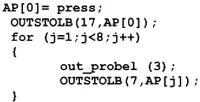 Третий тип вывода - это вывод гистограммы, столбцы которой представляют собой значения давления, снятые ровно в полночь, за сегодняшний день и за всю предыдущую неделю. Эти значения давления сформированы в виде массива с восемью элементами (AP[8]). Поскольку измерение параметров производится раз в десять минут, то в час происходит шесть измерений, а в сутки - 144, что нетрудно подсчитать. В полночь, когда произведены все 144 измерения, эти значения просто переписываются одно в другое, т. е. сегодняшнее давление переписывается во вчерашнее, вчерашнее - в позавчерашнее и т. д. до конца недели. Как это выглядит в программе, показано в табл. 2.