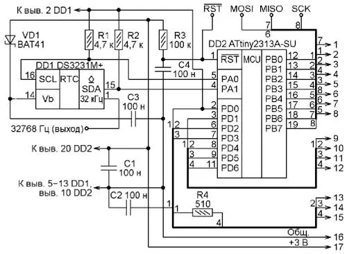 Чтобы вписаться в габариты наручных часов, компоненты хронометра размещены на двух печатных платах. На нижней плате, схема которой изображена на рис. 1, находятся микросхема прецизионных часов реального времени DS3231M+ (DD1) и микроконтроллер ATtiny2313A-SU (DD2). Микроконтроллер тактирован от внутреннего RC-генератора, что освободило его выводы PA0 и Pa1 для связи с часовой микросхемой по интерфейсу I2C.