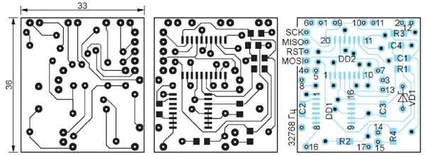 Чертёж нижней печатной платы изображён на рис. 2. Она рассчитана на установку элементов для поверхностного монтажа - резисторов и конденсаторов типоразмера 1206, микросхем в корпусах SOIC. На плате предусмотрены контакты для связи микроконтроллера с программатором.