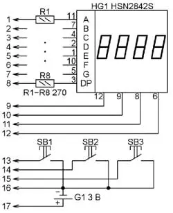 Индикатором HG1 программа управляет с помощью восьмиразрядного таймера T0. По запросам прерывания от таймера информация выводится на индикатор, одновременно идёт подсчёт времени работы индикатора. Максимальная продолжительность его непрерывной работы задана константой TimeDisp и по умолчанию равна 4,7 с. Отсчёт времени работы индикатора (показа текущего времени) начинается с момента нажатия на кнопку SB1.