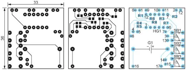 Платы изготовлены из фольгированного с двух сторон стеклотекстолита толщиной 1 мм. После изготовления необходимо тщательно проверить печатные проводники на обрыв и замыкание. Межплатные перемычки впаивают в нижнюю плату после монтажа деталей. Учитывая высокую плотность монтажа и малую ширину проводников, перед соединением плат между собой обязательно следует ещё раз убедиться в отсутствии на них обрывов и замыканий. Между платами должна быть вставлена изолирующая прокладка из тонкого плотного картона.