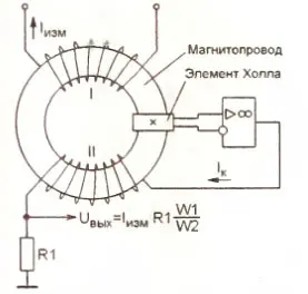 Измеряемый ток Iизм, протекая по обмотке I. создает в магнитопроводе магнитный поток, наводящий в чувствительном элементе Холла ЭДС пропорциональную этому току. Снятый с элемента сигнал после усиления поступает на компенсационную обмотку II Протекающий по ней ток Iк создает в магнитопроводе магнитный поток противоположного направления. Магнитная система, элемент Холла и усилитель образуют петлю отрицательной обратной связи, поддерживающую равенство