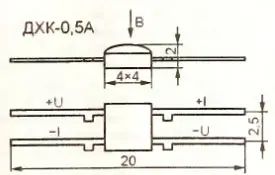 Габаритный чертеж использованного в датчике элемента Холла ДХК-0.5А изображен на рис. 2 Напряжение Холла, пропорциональное управляющему току и индукции магнитного поля, измеряют между выводами +U и -U. Чувствительность элемента при номинальном значении управляющего тока 3 мА (втекающего в вывод +I и вытекающего из вывода -I) - 280 мВ/Тл. Указанные полярность напряжения и направление тока соответствуют вектору магнитной индукции В, направленному, как показано на рис. 2 стрелкой. Остаточное выходное напряжение (в отсутствие магнитного поля) не превышает 7 мВ Входное сопротивление (между выводами I) - 1,8...3 кОм, выходное (между выводами U) - не более 3 кОм.