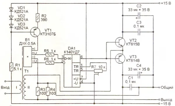 Для питания датчика необходим биполярныи источник постоянного напряжения +/-15 В Основной потребитель его энергии - обмотка II трансформатора Т1. В описываемой конструкции обмотки намотаны на ферри-товом кольце от блока питания компьютера. Обмотка II - 1000 витков провода ПЭВ-2 диаметром 0.15 мм Поверх нее намотана обмотка 1 - 10 витков изолированного монтажного провода сечением 0,35 мм2. В кольце сделан воздушный зазор длиной 2 мм - она равна толщине вклеиваемого в зазор элемента Холла