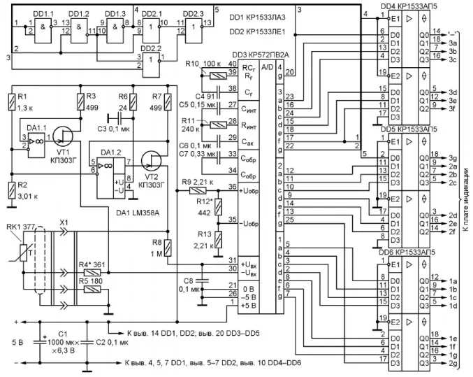 Прибор состоит из двух частей: платы собственно термометра (его схема показана на рис. 1) и платы индикации (рис. 2). Термометр построен на основе аналого-цифрового преобразователя КР572ПВ2А (DD3). В качестве датчика температуры RK1 использована катушка медного провода - обмотка герконового реле РЭС55 с номинальным сопротивлением 377 Ом (такую обмотку имеют реле исполнений РС4.569.600-01, РС4.569.600-06, РС4. 569.600-10, РС4.569.600-14 и РС4.569. 625-01, РС4.569.625-06, РС4.569.625-11). Сопротивление обмотки указано в справочнике [1] при температуре окружающей среды 20 оС. Температурный коэффициент сопротивления меди при этой температуре равен 0,392 %/оС. Изменение температуры на 100 оС вызывает изменение сопротивления ΔR = 377x0,392 = 147,784 Ом.