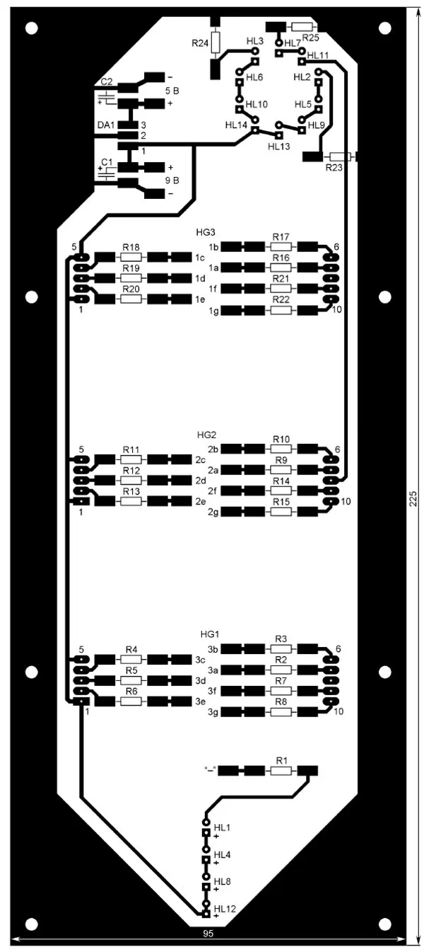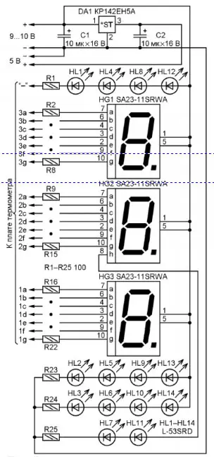 Светодиоды HL2, HL3, HL5-HL7, HL9-HL11, HL13, HL14 служат для отображения знака градуса Цельсия. Напряжение питания всего устройства поддерживается неизменным с помощью интегрального стабилизатора DA1.