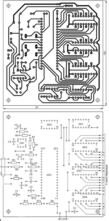 Смонтированную и отлаженную плату термометра закрепляют с помощью винтов с гайками и втулок на плате индикаторов.