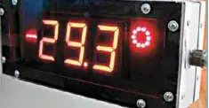 Корпус прибора изготовлен из пластин алюкобонда - листового композитного материала толщиной 3 мм, состоящего из двух окрашенных алюминиевых листов толщиной до 0,5 мм, между которыми вклеен полимерный (на основе полиэтилена низкого давления) лист, и алюминиевых уголков, скреплённых заклёпками. Передняя стенка выполнена из бесцветного органического стекла. Для повышения контрастности показаний и для того, чтобы не проглядывались внутренности термометра, на неё накатана тонировочная плёнка с прозрачностью 50 %. Внешний вид прибора показан на рис. 5.