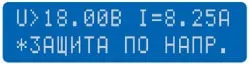 В зависимости от причины срабатывания защиты по-разному себя ведут ЖКИ, звуковой сигнализатор HA1 и светодиоды HL1, HL2. При превышении допустимого напряжения будетвключён светодиод HL1, а в левой половине верхней строки экрана ЖКИ появится мигающая надпись с указанием превышенного значения. В нижней строке будет выведена (как на рис. 3) надпись "ЗАЩИТА ПО НАПР.". Излучатель звука HA1 станет подавать короткие двухтональные сигналы (8267 и 8346 Гц), повторяющиеся каждую секунду.