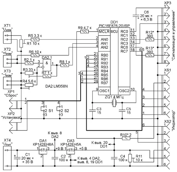 Датчик тока RS1 - самодельный. Это отрезок нихромовой проволоки диаметром 1,2 мм и длиной 20 мм. Его расчётное сопротивление - 0,02 Ом. Особая точность не требуется, поскольку прибор всё равно придётся калибровать. Не стоит применять проволоку меньшего диаметра, так как при большом токе она будет сильно нагреваться. Следует иметь в виду, что длина отрезка проволоки должна быть немного больше указанной, чтобы его концы можно было вставить в гнёзда контактных колодок XT2 и XT3 и зажать там винтами. Действующую длину отрезка измеряют между точками зажима.