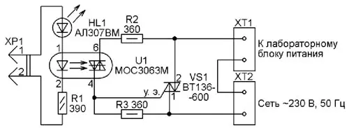 Принципиальная схема коммутатора изображена на рис. 6. Управляющее напряжение около 5 В, поступившее на его разъём XP1, через светодиод HL1, служащий индикатором команды открывания коммутатора, и резистор R1 подано на излучающий диод симистор-ного оптрона U1. Это открывает фото-симистор оптрона, а следом за ним открывается и симистор VS1. Он соединяет контакты колодок XT1 и XT2, подавая этим питающее напряжение ~230 В на ЛБП.