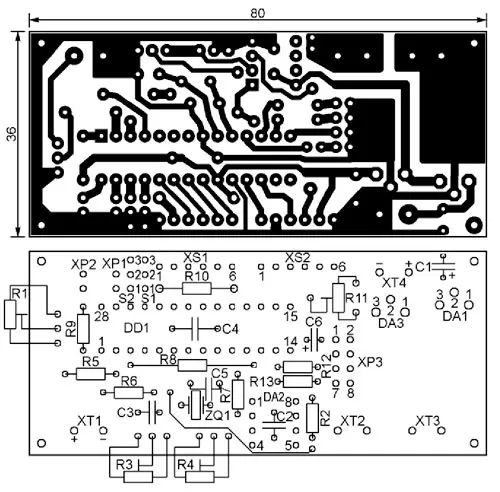 Все детали БИЗ размещены на печатной плате из фольгированного с одной стороны стеклотекстолита толщиной 1,5 мм (рис. 7) c такими же размерами (80x36 мм) и расположением крепёжных отверстий, что и плата ЖКИ. Это даёт возможность установить эти платы одну над другой на пустотелых втулках высотой 10...12 мм и соединить их четырьмя винтами М2,5 с гайками.