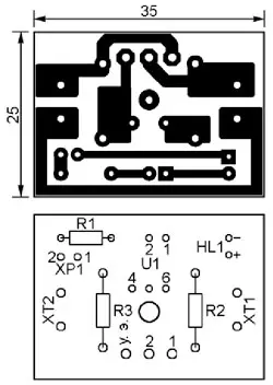 Коммутатор собран на отдельной печатной плате из фольгированного с одной стороны текстолита толщиной 1,5 мм и размерами 35x25 мм, изображённой на рис. 8. Симисторный оптрон U1 MOC3063M [2] имеет встроенный узел обнаружения перехода мгновенного значения коммутируемого напряжения через ноль. Это позволяет открывать симистор VS1 именно в эти моменты, что значительно снижает уровень коммутационных помех. Прямые замены оптрона MOC3063M - MOC3043M и MOC3083M. У них ток излучающего диода IFT, необходимый для гарантированного открывания фотосимистора, лежит в интервале 3...5 мА.