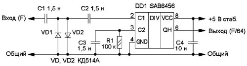 При выборе деталей для ВЧ-щупа с делителем частоты оказалось, что стоимость их может превышать стоимость самого частотомера. Бюджетный вариант можно построить на микросхемах серии SAB6456 [2] или U664 [3], а у них минимальный коэффициент деления равен 64. Естественно, расчёт частоты при этом выполняет МК. Схема ВЧ-щупа приведена на рис. 1, она достаточно широко представлена в Интернете. Его чувствительность в диапазоне 70 МГц...1 ГГц - 10 мВ. В диапазоне 30...70 МГц он также работает, ночувст-вительность ниже. При использовании элементов для поверхностного монтажа плата ВЧ-щупа без труда поместится вместе с экраном в корпусе от маркера.